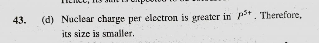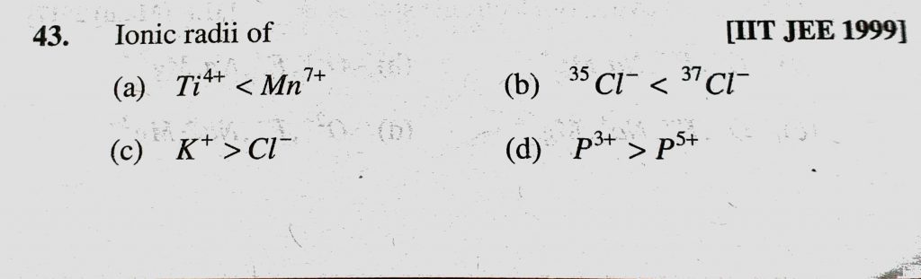 Ionic radii of (a) Ti 4+ < Mn 7+ (b) 35Cl – Cl- (c) P 3+ > P 5+ Ionic radii of (a) Ti 4+ < Mn 7+ (b) 35Cl - Cl- (c) P 3+ > P 5+ November 10, 2020 Category: Uncategorised (JEE Advanced Physics by BM Sharma + GMP Solutions) , Facebook Messenger WhatsApp Share this:TwitterFacebook Related