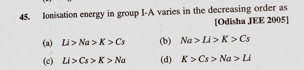 Ionisation energy in group I – A varies in the decreasing order as (a) Li > Na > K > Cs (b) Na > Li > K > Cs Ionisation energy in group I - A varies in the decreasing order as (a) Li > Na > K > Cs (b) Na > Li > K > Cs November 9, 2020 Category: Uncategorised (JEE Advanced Physics by BM Sharma + GMP Solutions) , Facebook Messenger WhatsApp Share this:TwitterFacebook Related