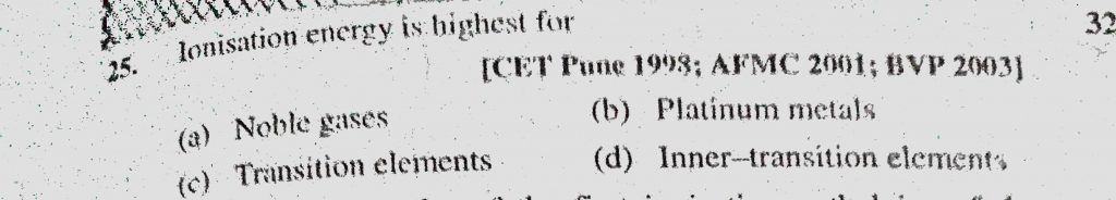Ionisation energy is highest for (a) Noble gases (b) Platinum metals (c) Transition element (d) Inner-transition elements Ionisation energy is highest for (a) Noble gases (b) Platinum metals (c) Transition element (d) Inner-transition elements November 9, 2020 Category: Uncategorised (JEE Advanced Physics by BM Sharma + GMP Solutions) , Facebook Messenger WhatsApp Share this:TwitterFacebook Related