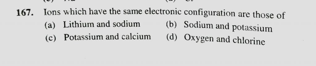 Ions which have the same electronic configuration are those of (a) Lithium and sodium (b) Sodium and postassium (c) Potassium and calcium (d) Oxygen and chlorine Ions which have the same electronic configuration are those of (a) Lithium and sodium (b) Sodium and postassium (c) Potassium and calcium (d) Oxygen and chlorine November 29, 2020 Category: Uncategorised (JEE Advanced Physics by BM Sharma + GMP Solutions) , Facebook Messenger WhatsApp Share this:TwitterFacebook Related