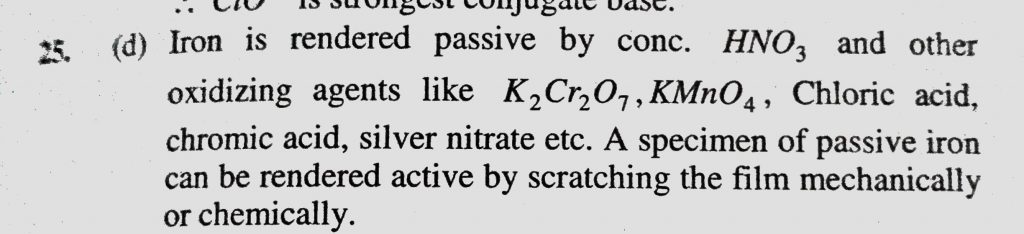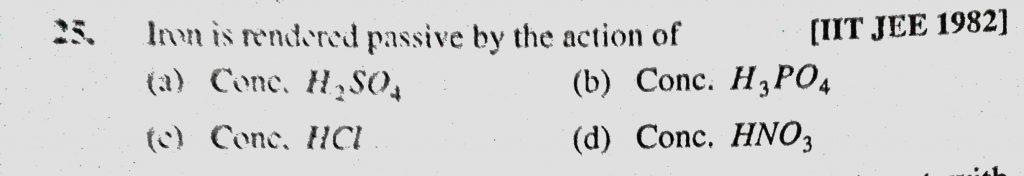 Iron is rendered passive by the action of (a) Conc. H2SO4 (b) Conc. H3PO4 (c) Conc. HCl (d) Conc. HNO3 Iron is rendered passive by the action of (a) Conc. H2SO4 (b) Conc. H3PO4 (c) Conc. HCl (d) Conc. HNO3 December 2, 2020 Category: Uncategorised (JEE Advanced Physics by BM Sharma + GMP Solutions) , Facebook Messenger WhatsApp Share this:TwitterFacebook Related