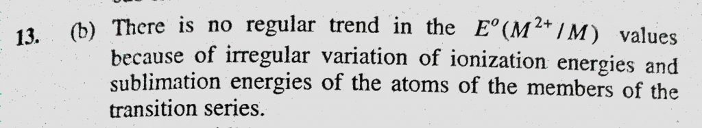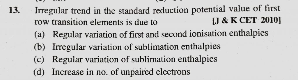 Irregular trend in the standard reduction potential value of first row transition elements is due to (a) Regular variation of first and second ionisation enthalpies Irregular trend in the standard reduction potential value of first row transition elements is due to (a) Regular variation of first and second ionisation enthalpies December 2, 2020 Category: Uncategorised (JEE Advanced Physics by BM Sharma + GMP Solutions) , Facebook Messenger WhatsApp Share this:TwitterFacebook Related