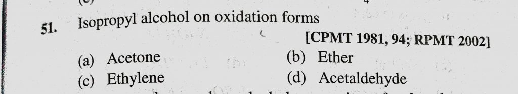 Isopropyl alcohol on oxidation forms (a) Acetone (b) Ether (c) Ethylene (d) Acetaldehyde Isopropyl alcohol on oxidation forms (a) Acetone (b) Ether (c) Ethylene (d) Acetaldehyde February 10, 2021 Category: Uncategorised (JEE Advanced Physics by BM Sharma + GMP Solutions) , Facebook Messenger WhatsApp Share this:TwitterFacebook Related