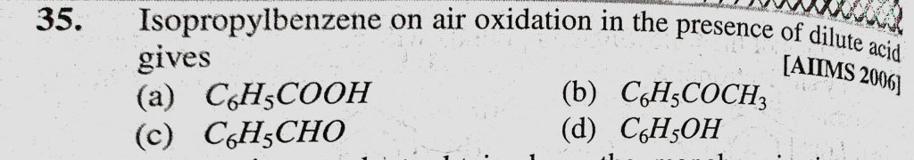 Isopropylbenzene on air oxidation in the presence of diluted acid gives (a) C6H5COOH (b) C6H5COCH3 (c) C6H5CHO (d) C6H5OH Isopropylbenzene on air oxidation in the presence of diluted acid gives (a) C6H5COOH (b) C6H5COCH3 (c) C6H5CHO (d) C6H5OH February 10, 2021 Category: Uncategorised (JEE Advanced Physics by BM Sharma + GMP Solutions) , Facebook Messenger WhatsApp Share this:TwitterFacebook Related