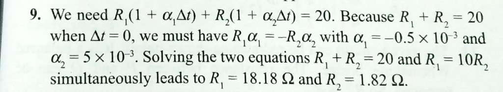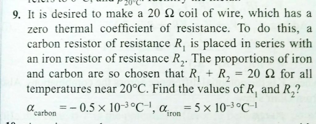 It is desired to make a 20 Ω coil of wire, which has a zero thermal coefficient of resistance. To do this, a carbon resitor fo resistane R1 is placed in series with an iron resistor of resistance R2 the proportions of iron and carbon are so chosen that R1+R2=20Ω for all temperatures near 20∘C. How long are R1 and R2? αcarbon =− 0.5 × 10^−3.∘ C−1 , α iron = 5×10^−3.∘C(−1)