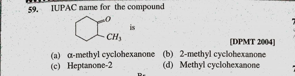 IUPAC name for the compound is (a) alpha-methyl cyclohexanone (b) 2-methyl cyclohexanone IUPAC name for the compound is (a) alpha-methyl cyclohexanone (b) 2-methyl cyclohexanone December 10, 2020 Category: Uncategorised (JEE Advanced Physics by BM Sharma + GMP Solutions) , Facebook Messenger WhatsApp Share this:TwitterFacebook Related