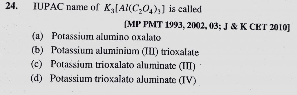 IUPAC name of K3(Al(C2O4)3) is called (a) Potassium alumino oxalato (b) Potassium aluminium (III) trioxalate IUPAC name of K3(Al(C2O4)3) is called (a) Potassium alumino oxalato (b) Potassium aluminium (III) trioxalate December 3, 2020 Category: Uncategorised (JEE Advanced Physics by BM Sharma + GMP Solutions) , Facebook Messenger WhatsApp Share this:TwitterFacebook Related