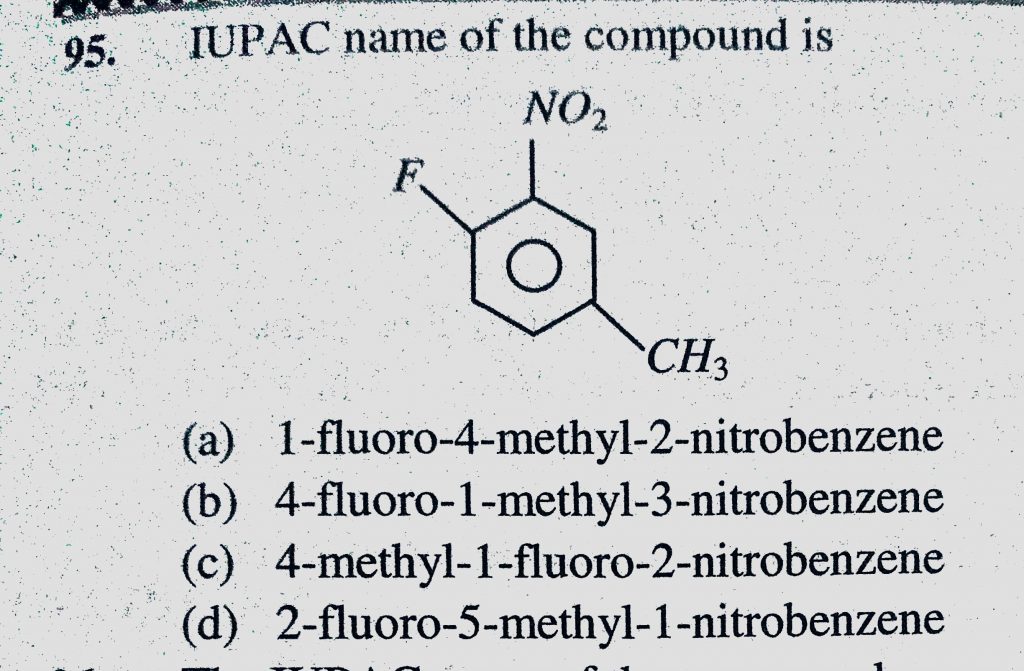 IUPAC name of the compound is (a) 1-fluoro-4-methyl-2-nitrobenzene (b) 4-fluoro-1-methyl-3-nitrobenzene IUPAC name of the compound is (a) 1-fluoro-4-methyl-2-nitrobenzene (b) 4-fluoro-1-methyl-3-nitrobenzene December 11, 2020 Category: Uncategorised (JEE Advanced Physics by BM Sharma + GMP Solutions) , Facebook Messenger WhatsApp Share this:TwitterFacebook Related