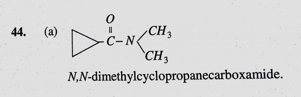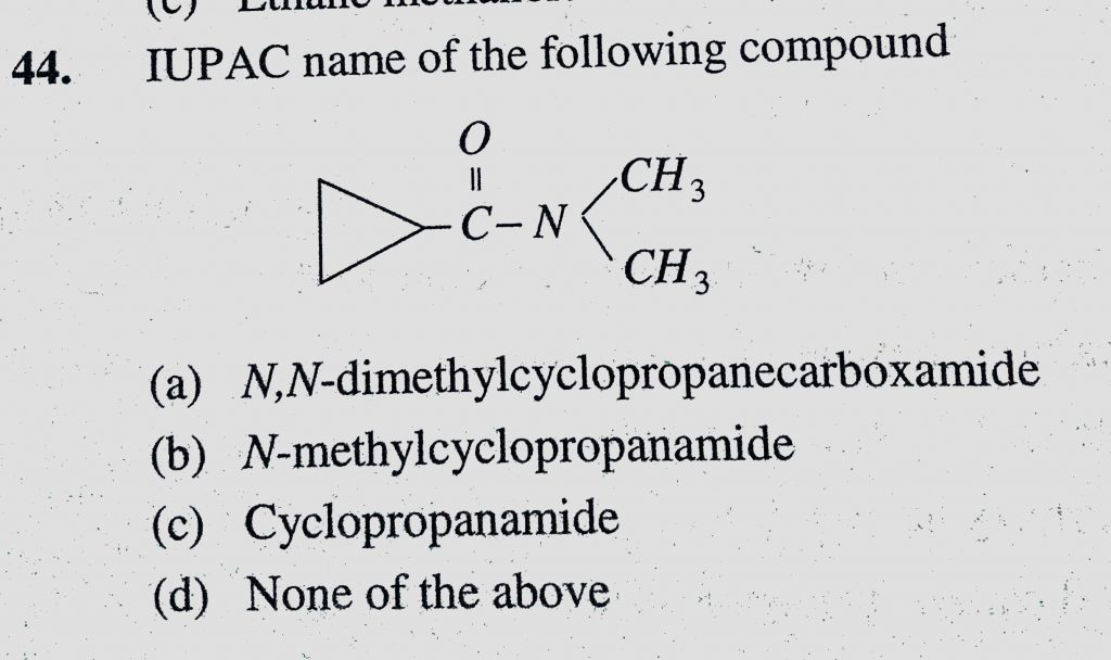 IUPAC name of the following compound (a) N, N-dimethylcyclopropanecarboxamide (b) N-methylcyclopropanamide IUPAC name of the following compound (a) N N-dimethylcyclopropanecarboxamide (b) N-methylcyclopropanamide December 10, 2020 Category: Uncategorised (JEE Advanced Physics by BM Sharma + GMP Solutions) , Facebook Messenger WhatsApp Share this:TwitterFacebook Related