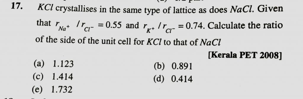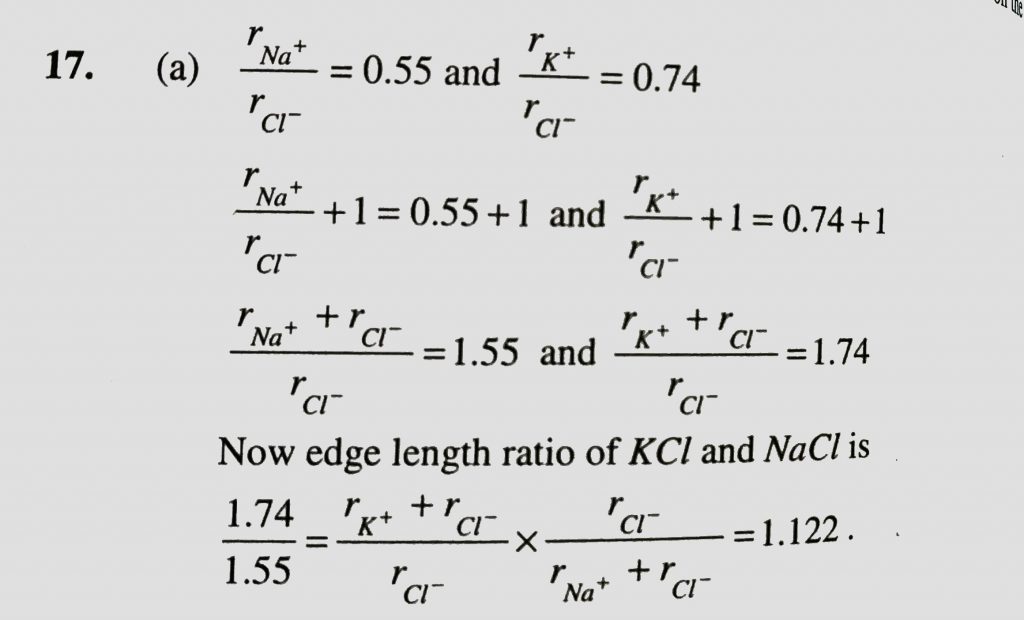 KCl crystallises in the same type of lattice as does NaCl. Given that r Na + /r Cl ^ − = 0.55 and r K + /r Cl − =0.74. Calculate the ratio of the side of the unit cell for KCl to that of NaCl. KCl crystallises in the same type of lattice as does NaCl. Given that r Na + /r Cl ^ − = 0.55 and r K + /r Cl − =0.74. Calculate the ratio of the side of the unit cell for KCl to that of NaCl. December 16, 2020 Category: Uncategorised (JEE Advanced Physics by BM Sharma + GMP Solutions) , Facebook Messenger WhatsApp Share this:TwitterFacebook Related