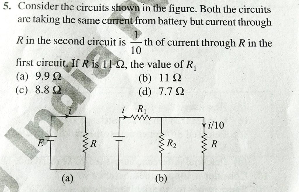 Consider the circuit shown in the figure. Both the circuits are taking same current from battery but current through `R` in the second circuit is `(1)/(10) th` of current through `R` in the first circuit. If `R` is `11 Omega`, the value of `R_(1)` Kirchhoff's junction rule is a reflection of a) conservation of current density vector b) conservation of charge September 19, 2020 Category: Uncategorised (JEE Advanced Physics by BM Sharma + GMP Solutions) , Facebook Messenger WhatsApp Share this:TwitterFacebook Related