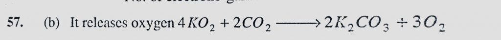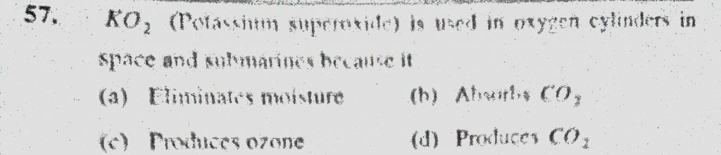 KO2 (Potassium superoxide) is used in oxygen cylinders in space and submarines because (a) Eliminates moisture (b) Absorbs CO2 KO2 (Potassium superoxide) is used in oxygen cylinders in space and submarines because (a) Eliminates moisture (b) Absorbs CO2 December 2, 2020 Category: Uncategorised (JEE Advanced Physics by BM Sharma + GMP Solutions) , Facebook Messenger WhatsApp Share this:TwitterFacebook Related