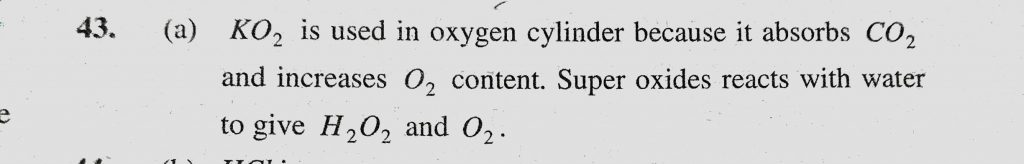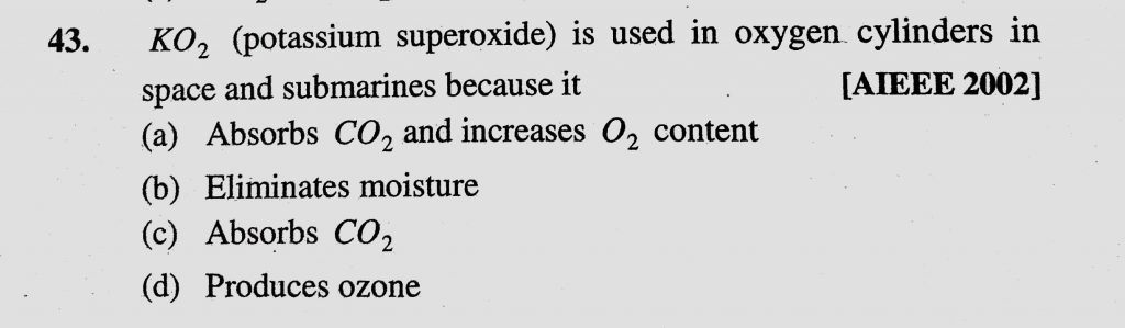 KO2 (potassium superoxide) is used in oxygen cylinders in space and submarines because it (a) Absorbs CO2 and increases O2 content KO2 (potassium superoxide) is used in oxygen cylinders in space and submarines because it (a) Absorbs CO2 and increases O2 content November 27, 2020 Category: Uncategorised (JEE Advanced Physics by BM Sharma + GMP Solutions) , Facebook Messenger WhatsApp Share this:TwitterFacebook Related