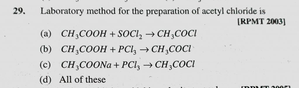 Laboratory method for the preparation of acetyl chloride is (a) CH3COOH + SOCl2 to CH3COCl (b) CH3COOH + PCl3 to CH3COCl Laboratory method for the preparation of acetyl chloride is (a) CH3COOH + SOCl2 to CH3COCl (b) CH3COOH + PCl3 to CH3COCl February 13, 2021 Category: Uncategorised (JEE Advanced Physics by BM Sharma + GMP Solutions) , Facebook Messenger WhatsApp Share this:TwitterFacebook Related