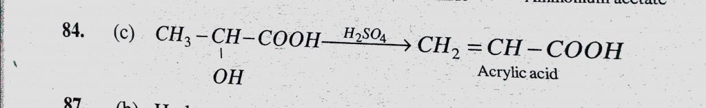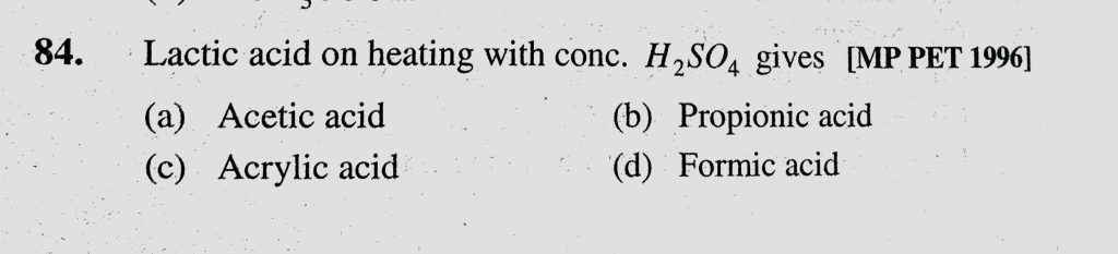 Lactic acid on heating with conc. H2SO4 gives (a) Acetic acid (b) Propionic acid (c) Acrylic acid (d) Formic acid Lactic acid on heating with conc. H2SO4 gives (a) Acetic acid (b) Propionic acid (c) Acrylic acid (d) Formic acid February 13, 2021 Category: Uncategorised (JEE Advanced Physics by BM Sharma + GMP Solutions) , Facebook Messenger WhatsApp Share this:TwitterFacebook Related