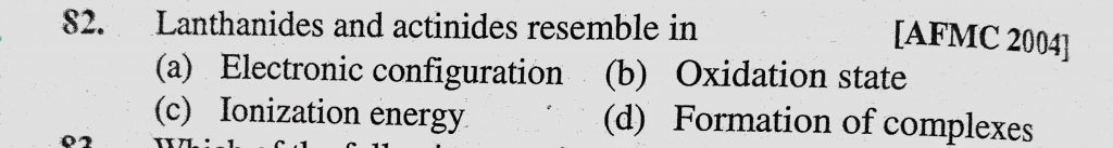 Lanthanides and actinides resemble in (a) Electronic configuration (b) Oxidation state (c) Ionization energy (d) Formation of complexes Lanthanides and actinides resemble in (a) Electronic configuration (b) Oxidation state (c) Ionization energy (d) Formation of complexes November 30, 2020 Category: Uncategorised (JEE Advanced Physics by BM Sharma + GMP Solutions) , Facebook Messenger WhatsApp Share this:TwitterFacebook Related