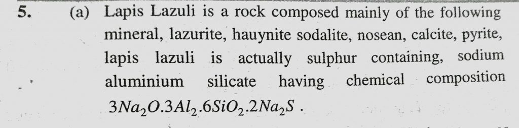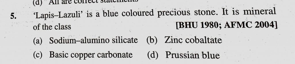 ‘Lapis-Lazuli’ is a blue coloured precious stone. It is mineral of the class (a) Sodium-alumino silicate (b) Zinc cobaltate (c) Basic copper carbonate 'Lapis-Lazuli' is a blue coloured precious stone. It is mineral of the class (a) Sodium-alumino silicate (b) Zinc cobaltate (c) Basic copper carbonate November 12, 2020 Category: Uncategorised (JEE Advanced Physics by BM Sharma + GMP Solutions) , Facebook Messenger WhatsApp Share this:TwitterFacebook Related