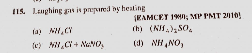 Laughing gas is prepared by heating (a) NH4Cl (b) (NH4)2SO4 (c) NH4Cl + NaNO3 (d) NH4NO3 Laughing gas is prepared by heating (a) NH4Cl (b) (NH4)2SO4 (c) NH4Cl + NaNO3 (d) NH4NO3 November 22, 2020 Category: Uncategorised (JEE Advanced Physics by BM Sharma + GMP Solutions) , Facebook Messenger WhatsApp Share this:TwitterFacebook Related