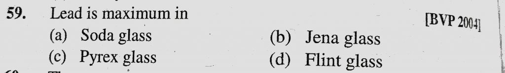 Lead is maximum in (a) Soda glass (b) Jena glass (c) Pyrex glass (d) Flint glass Lead is maximum in (a) Soda glass (b) Jena glass (c) Pyrex glass (d) Flint glass November 27, 2020 Category: Uncategorised (JEE Advanced Physics by BM Sharma + GMP Solutions) , Facebook Messenger WhatsApp Share this:TwitterFacebook Related