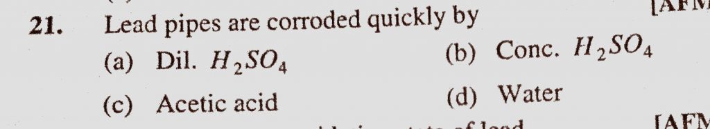 Lead pipes are corroded quickly by (a) Dil. H2SO4 (b) Conc. H2SO4 (c) Acetic acid (d) water Lead pipes are corroded quickly by (a) Dil. H2SO4 (b) Conc. H2SO4 (c) Acetic acid (d) water November 17, 2020 Category: Uncategorised (JEE Advanced Physics by BM Sharma + GMP Solutions) , Facebook Messenger WhatsApp Share this:TwitterFacebook Related