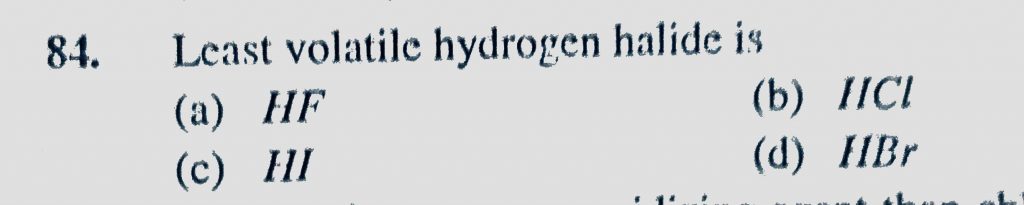 Least volatile hydrogen halide is (a) HF (b) HCl (c) HI (d) HBr Least volatile hydrogen halide is (a) HF (b) HCl (c) HI (d) HBr November 24, 2020 Category: Uncategorised (JEE Advanced Physics by BM Sharma + GMP Solutions) , Facebook Messenger WhatsApp Share this:TwitterFacebook Related