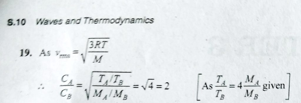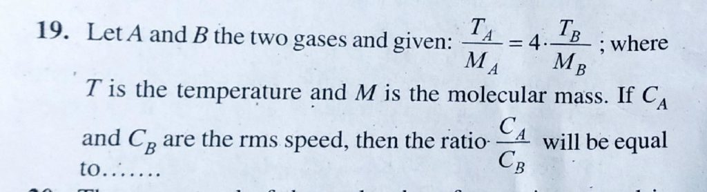 Let A and B the two gases and given: TA/MA = 4. TB/ MB, where T is the temperature and M is the molecular mass. If CA and CB are the rms speed, then the ratio CA/CB will be equal to ……….. Let A and B the two gases and given: TA/MA = 4. TB/ MB then the ratio CA/CB will be equal to ……….. where T is the temperature and M is the molecular mass. If CA and CB are the rms speed October 4, 2020 Category: Uncategorised (JEE Advanced Physics by BM Sharma + GMP Solutions) , Facebook Messenger WhatsApp Share this:TwitterFacebook Related