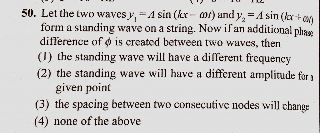 Let the two waves y1 = A sin (kx – omega t ) and Y2 = A sin (kx + omega t) form a standing wave on a string. Now if an additional phase difference of phi is created between two Let the two waves y1 = A sin (kx - omega t ) and Y2 = A sin (kx + omega t) form a standing wave on a string. Now if an additional phase difference of phi is created between two November 6, 2020 Category: Uncategorised (JEE Advanced Physics by BM Sharma + GMP Solutions) , Facebook Messenger WhatsApp Share this:TwitterFacebook Related