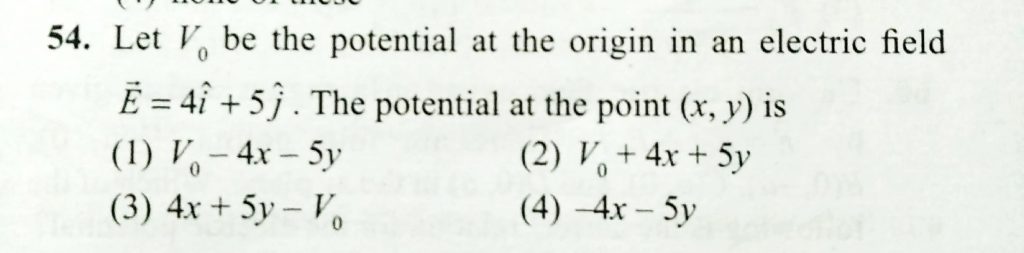 Let V0 be the potential at the origin in an electric field E = 4i + 5j. The potential at the point ( x, y ) is Let V0 be the potential at the origin in an electric field E = 4i + 5j. The potential at the point ( x y ) is November 6, 2020 Category: Uncategorised (JEE Advanced Physics by BM Sharma + GMP Solutions) , Facebook Messenger WhatsApp Share this:TwitterFacebook Related