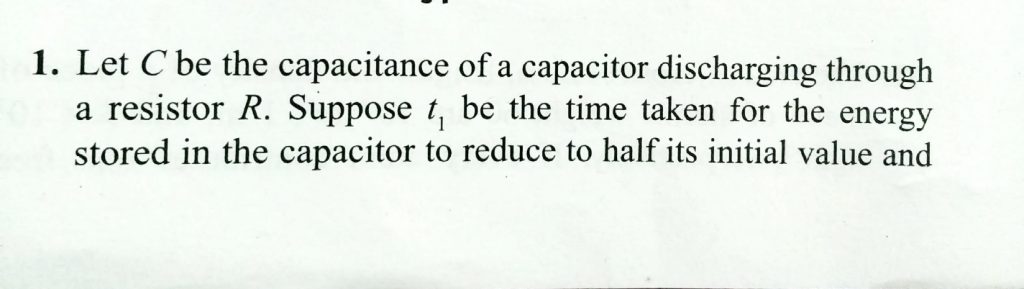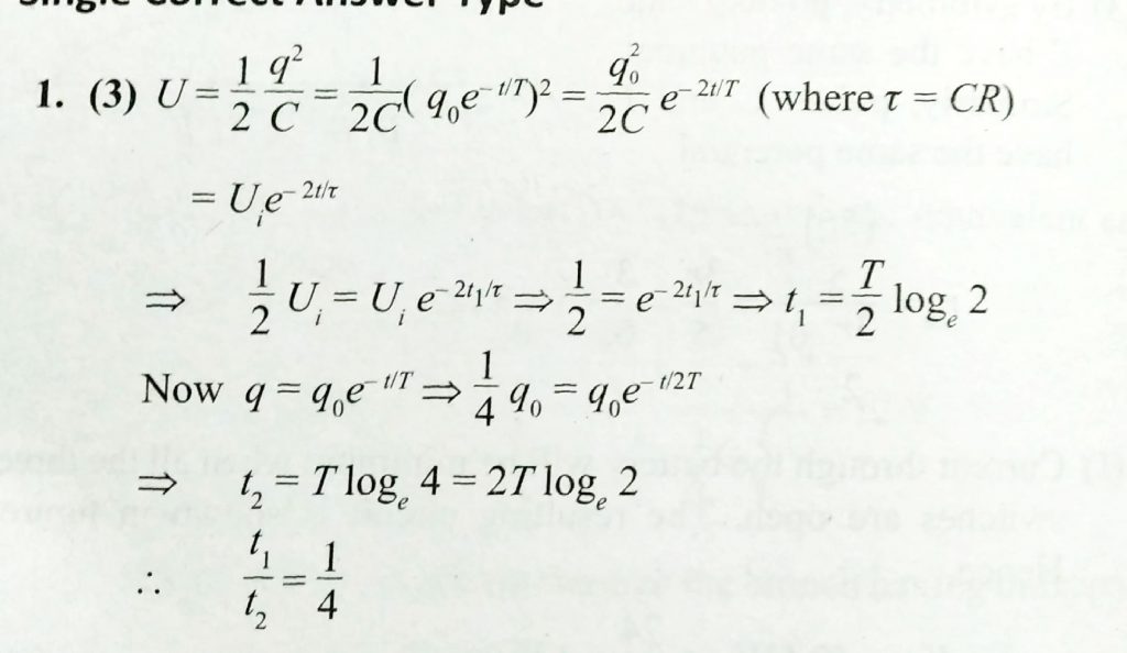 LetC be the capacitance of a capacitor discharging through a resistor R. Suppose t1 is the time taken for the energy stored in the capacitor to reduce to half its initial value and t2 is the time taken for the charge to reduce to one-fourth its initial value. Then the ratio t1/t2 will be