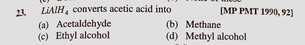 LiAlH4 converts acetic acid into (a) Acetaldehyde (b) Methane (c) Ethyl alcohol (d) Methyl alcohol LiAlH4 converts acetic acid into (a) Acetaldehyde (b) Methane (c) Ethyl alcohol (d) Methyl alcohol February 10, 2021 Category: Uncategorised (JEE Advanced Physics by BM Sharma + GMP Solutions) , Facebook Messenger WhatsApp Share this:TwitterFacebook Related