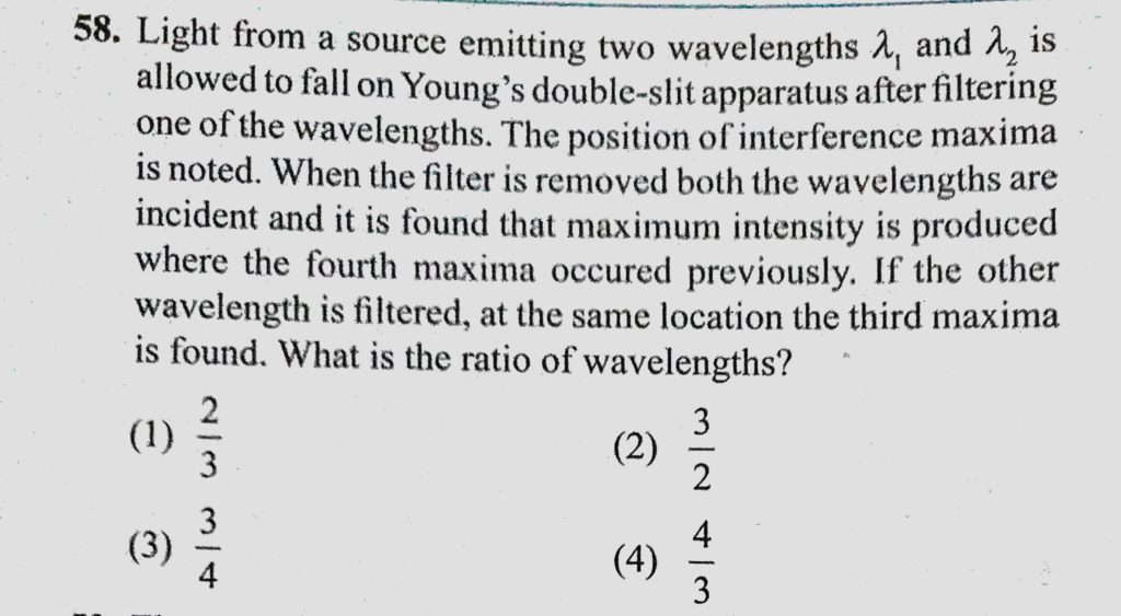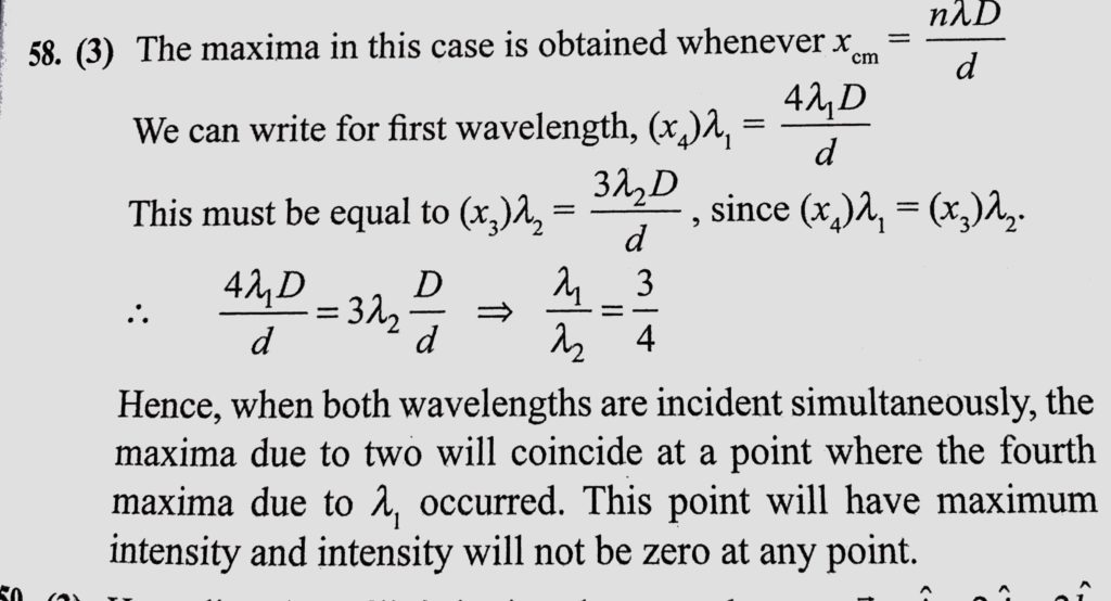 Light from a source emitting two wavelengths lemda1 and lemda 2 is allowed to fall on Young’s double-slit apparatus after filtering one of the wavelengths. The position of interference maxima is noted. A light of wavelength 6000 A shines on two narrow slits separated by a distance 1.0 mm and illuminates a screen at a distance 1.5 m away. When one slit is covered by a thin glass plate October 10, 2020 Category: Uncategorised (JEE Advanced Physics by BM Sharma + GMP Solutions) , Facebook Messenger WhatsApp Share this:TwitterFacebook Related