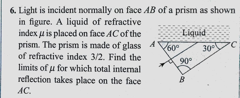 Light is incident normally on face AB of a prism as shown in figure. A liquid of refractive index mu is placed on face AC of the prism. The prism is made of glass of refractive index 3/2. Light is incident normally on face AB of a prism as shown in figure. A liquid of refractive index mu is placed on face AC of the prism. The prism is made of glass of refractive index 3/2. October 5, 2020 Category: Uncategorised (JEE Advanced Physics by BM Sharma + GMP Solutions) , Facebook Messenger WhatsApp Share this:TwitterFacebook Related
