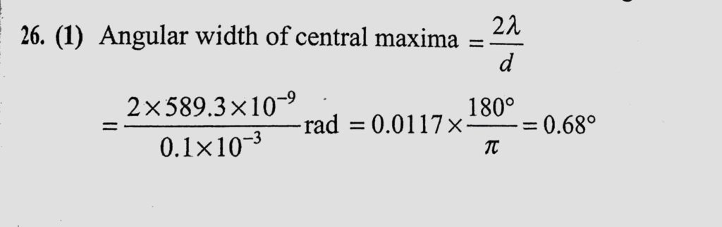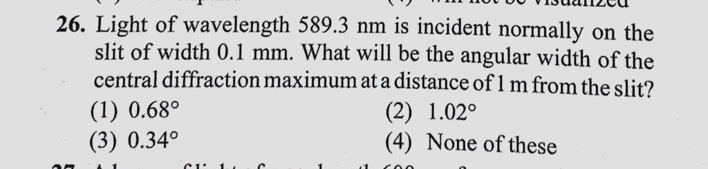 Light of wavelength 589.3 nm is incident normally on the slit of width 0.1 mm. What will be the angular width of the central diffraction maximum at a distance of 1 m from the slit? Light of wavelength 589.3 nm is incident normally on the slit of width 0.1 mm. What will be the angular width of the central diffraction maximum at a distance of 1 m from the slit? October 12, 2020 Category: Uncategorised (JEE Advanced Physics by BM Sharma + GMP Solutions) , Facebook Messenger WhatsApp Share this:TwitterFacebook Related
