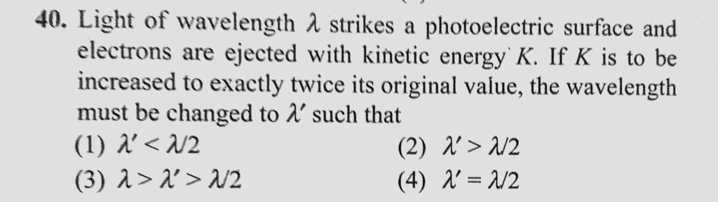 Light of wavelength lemda strikes a photoelectric surface and electrons are ejected with kinetic energy K. If K is to be increased to exactly twice its original value, the wavelength must be changed Light of wavelength lemda strikes a photoelectric surface and electrons are ejected with kinetic energy K. If K is to be increased to exactly twice its original value the wavelength must be changed October 14, 2020 Category: Uncategorised (JEE Advanced Physics by BM Sharma + GMP Solutions) , Facebook Messenger WhatsApp Share this:TwitterFacebook Related
