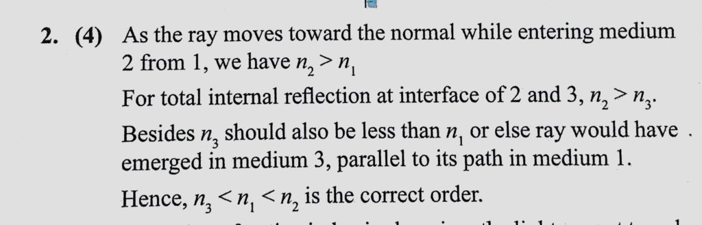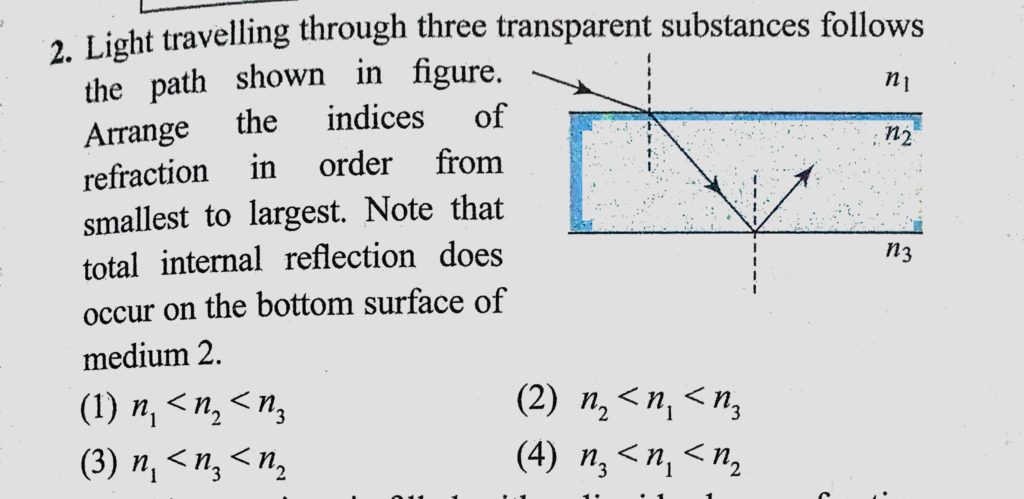 Light travelling through three transparent substances follows the path shown in figure. Arrange the indices of refraction in order from smallest to largest. Note that total internal reflection Light travelling through three transparent substances follows the path shown in figure. Arrange the indices of refraction in order from smallest to largest. Note that total internal reflection October 6, 2020 Category: Uncategorised (JEE Advanced Physics by BM Sharma + GMP Solutions) , Facebook Messenger WhatsApp Share this:TwitterFacebook Related