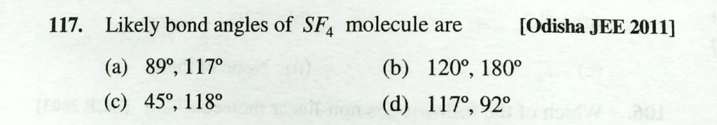 Likely bond angles of SF4 molecule are (a) 89degree , 117 degree (b) 120 degree, 180 degree (c) 45 degree, 118 degree (d) 117 degree , 92 degree 117 degree (b) 120 degree 118 degree (d) 117 degree 180 degree (c) 45 degree 92 degree Likely bond angles of SF4 molecule are (a) 89degree December 6, 2020 Category: Uncategorised (JEE Advanced Physics by BM Sharma + GMP Solutions) , Facebook Messenger WhatsApp Share this:TwitterFacebook Related