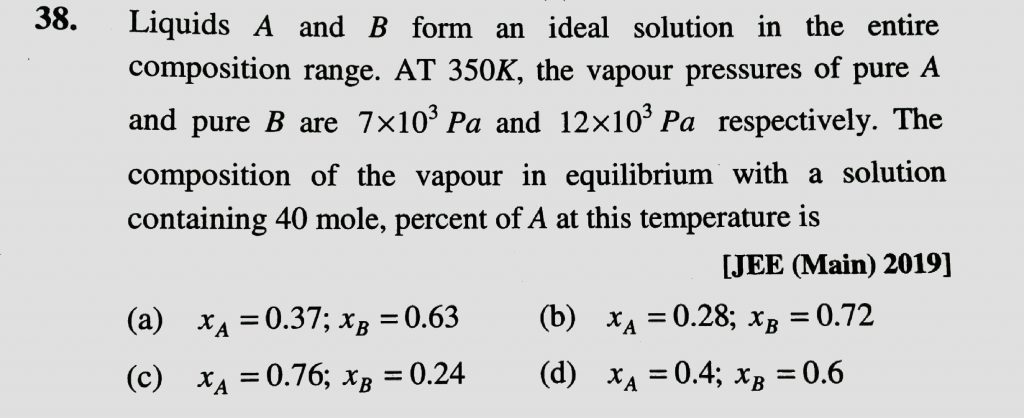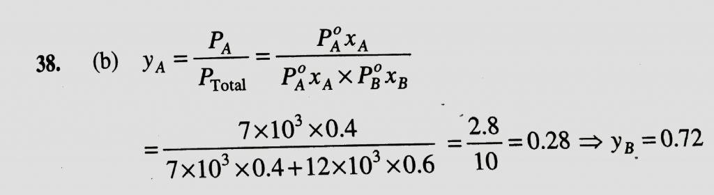 Liquids A and B form an ideal solution in the entire composition range. At 350K, the vapor pressure of pure A and pure B are 7×103 Pa and 12×103 Pa, respectively. The composition of the vapor in equilibrium with a solution containing 40 mole percent of A at this temperature is