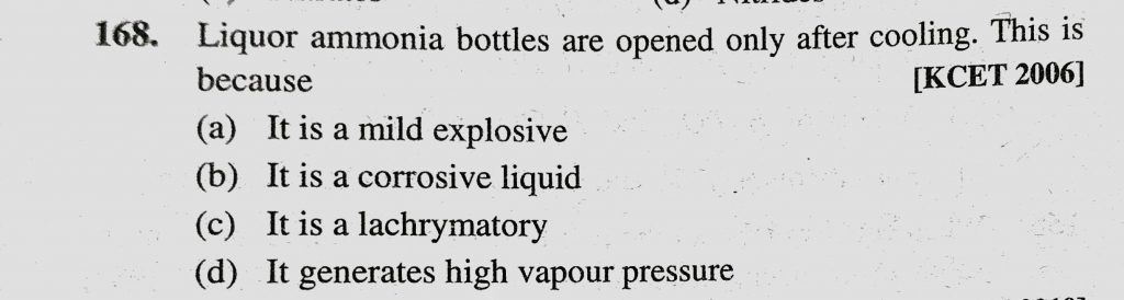 Liquor ammonia bottles are opened only after cooling. This is because (a) It is a mild explosive (b) It is a corrosive liquid (c) It is a lachrymatory Liquor ammonia bottles are opened only after cooling. This is because (a) It is a mild explosive (b) It is a corrosive liquid (c) It is a lachrymatory November 23, 2020 Category: Uncategorised (JEE Advanced Physics by BM Sharma + GMP Solutions) , Facebook Messenger WhatsApp Share this:TwitterFacebook Related