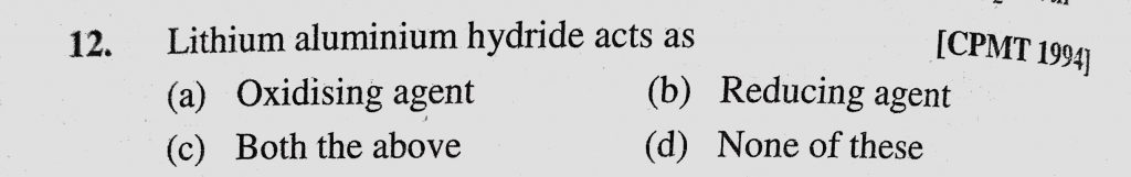 Lithium aluminium hydride acts as (a) Oxidising agent (b) Reducing agent (c) Both the above (d) None of these Lithium aluminium hydride acts as (a) Oxidising agent (b) Reducing agent (c) Both the above (d) None of these November 25, 2020 Category: Uncategorised (JEE Advanced Physics by BM Sharma + GMP Solutions) , Facebook Messenger WhatsApp Share this:TwitterFacebook Related