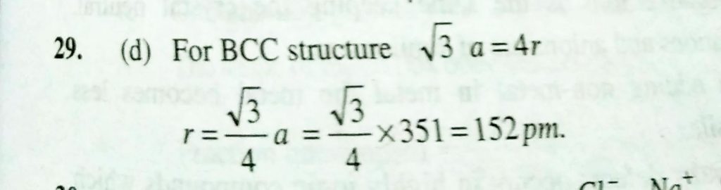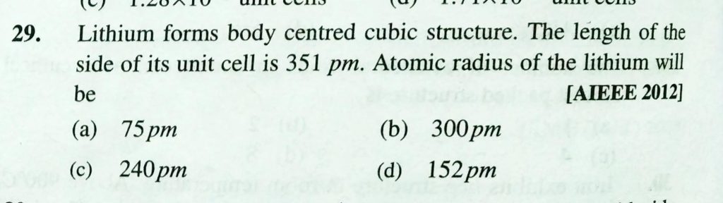 Lithium forms body centred cubic structure. The length of the side of its unit cell is 351 pm. Atomic radius of the lithium will be (a) 75 pm (b) 300 pm (c) 240 pm (d) 152 pm Lithium forms body centred cubic structure. The length of the side of its unit cell is 351 pm. Atomic radius of the lithium will be (a) 75 pm (b) 300 pm (c) 240 pm (d) 152 pm February 9, 2021 Category: Uncategorised (JEE Advanced Physics by BM Sharma + GMP Solutions) , Facebook Messenger WhatsApp Share this:TwitterFacebook Related