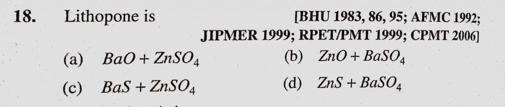Lithopone is (a) BaO + ZnSO4 (b) ZnO + BaSO4 (c) BaS + ZnSO4 (d) ZnS + BaSO4 Lithopone is (a) BaO + ZnSO4 (b) ZnO + BaSO4 (c) BaS + ZnSO4 (d) ZnS + BaSO4 November 15, 2020 Category: Uncategorised (JEE Advanced Physics by BM Sharma + GMP Solutions) , Facebook Messenger WhatsApp Share this:TwitterFacebook Related