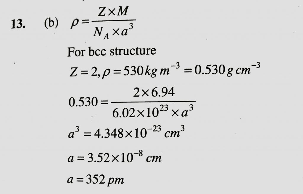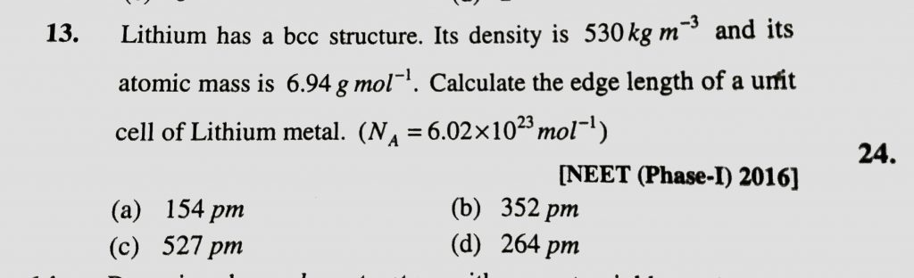Lithum has a bcc structure . Its density is 530 kg/m^3 and its atomic atomic mass is 6.94 g/mol. Calculate the edge length of a unit cell of Lithium metal . Lithum has a bcc structure . Its density is 530 kg/m^3 and its atomic atomic mass is 6.94 g/mol. Calculate the edge length of a unit cell of Lithium metal . December 16, 2020 Category: Uncategorised (JEE Advanced Physics by BM Sharma + GMP Solutions) , Facebook Messenger WhatsApp Share this:TwitterFacebook Related
