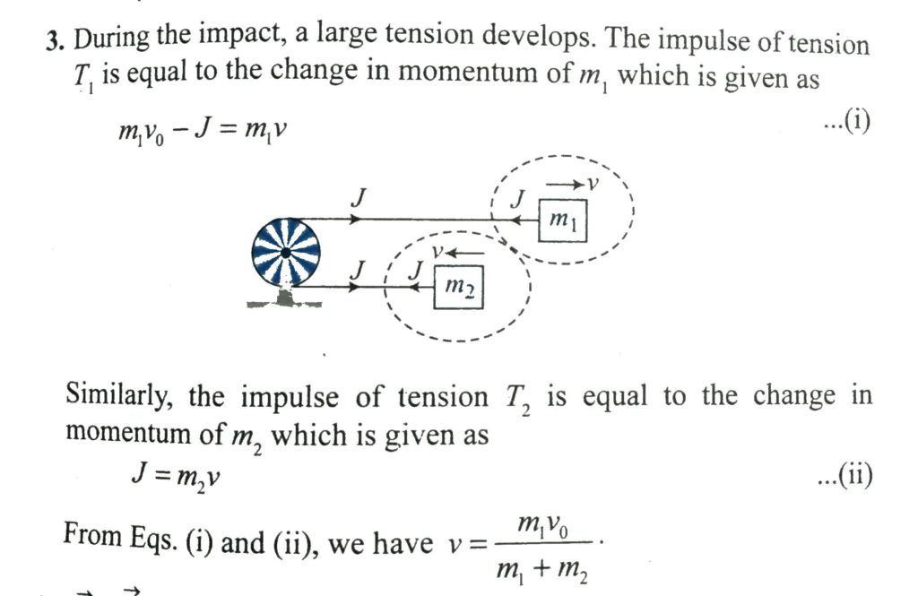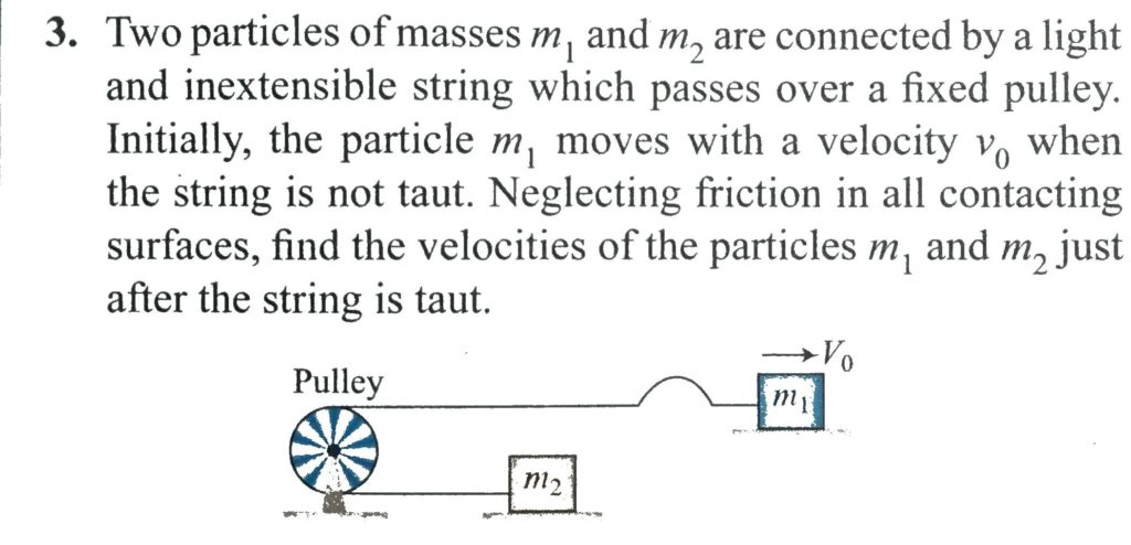 Two particles of masses m1 and m2 are connected by a light and inextensible string which passes over a fixed pulley. Initially, the particle m1 moves with velocity v0 when the string is not taut. Neglecting fricting in all contacting surface, find the velocities of the particles m1 and m2 just after the string is taut.