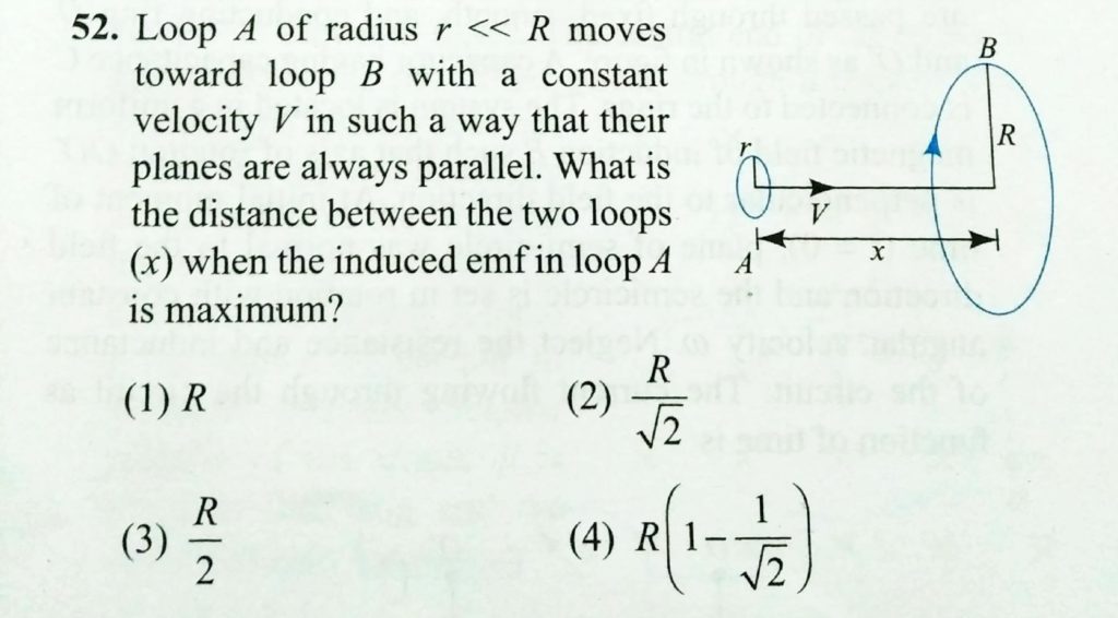 Loop A of radius r << R moves toward loop B with a constant velocity V in such a way that their planes are always parallel. what is the the distance between the two loops ( x ) when the induced emf in loop A is maximum ? the current in wire AB is ( ab is one of the diameters ) The radius of the circular conducting loop shown in figure is R. Magnetic field is decreasing at a constant rate alpha. Resistance per unit length of the loop is rho. Then October 20, 2020 Category: Uncategorised (JEE Advanced Physics by BM Sharma + GMP Solutions) , Facebook Messenger WhatsApp Share this:TwitterFacebook Related