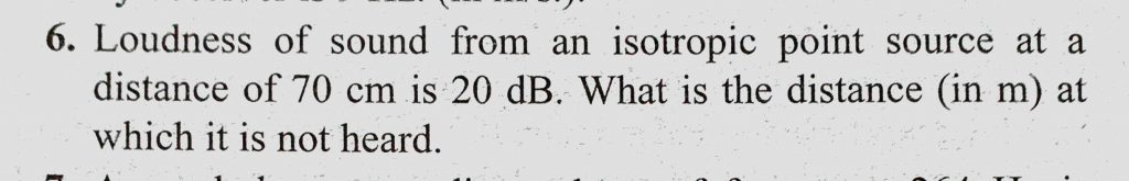 Loudness of sound from an isotropic point source at a distance of 70 cm is 20 dB. What is the distance (in m) at which it is not heard. Loudness of sound from an isotropic point source at a distance of 70 cm is 20 dB. What is the distance (in m) at which it is not heard. November 8, 2020 Category: Uncategorised (JEE Advanced Physics by BM Sharma + GMP Solutions) , Facebook Messenger WhatsApp Share this:TwitterFacebook Related