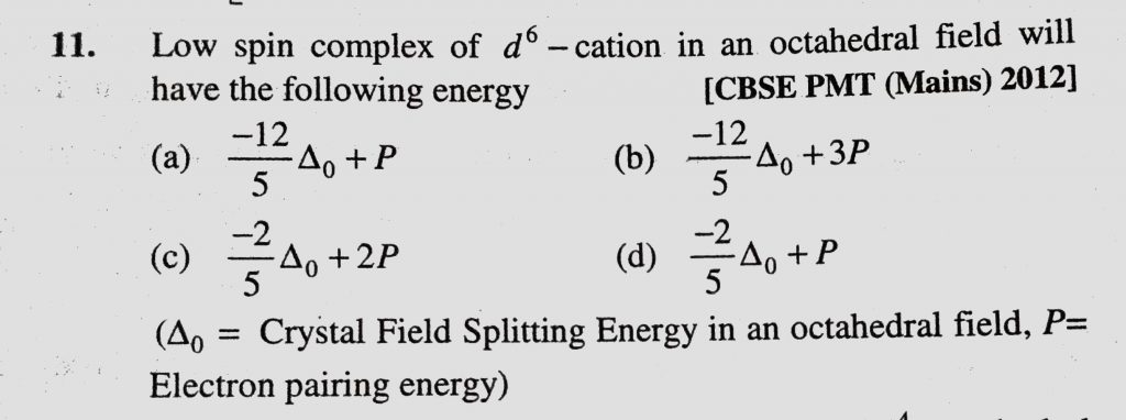 Low spin complex of d6-cation in an octahedral field will have the following energy (a) -12/5 delta 0 + P Low spin complex of d6-cation in an octahedral field will have the following energy (a) -12/5 delta 0 + P December 4, 2020 Category: Uncategorised (JEE Advanced Physics by BM Sharma + GMP Solutions) , Facebook Messenger WhatsApp Share this:TwitterFacebook Related