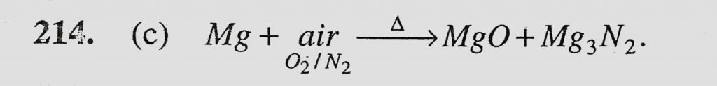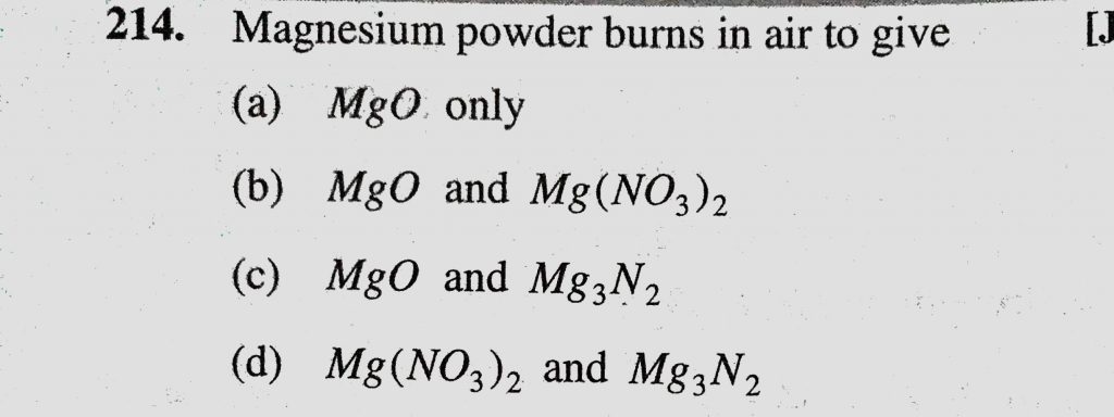 Magnesium powder burns in air to give (a) MgO only (b) MgO and Mg(NO3)2 (c) MgO and Mg3N2 Magnesium powder burns in air to give (a) MgO only (b) MgO and Mg(NO3)2 (c) MgO and Mg3N2 November 28, 2020 Category: Uncategorised (JEE Advanced Physics by BM Sharma + GMP Solutions) , Facebook Messenger WhatsApp Share this:TwitterFacebook Related