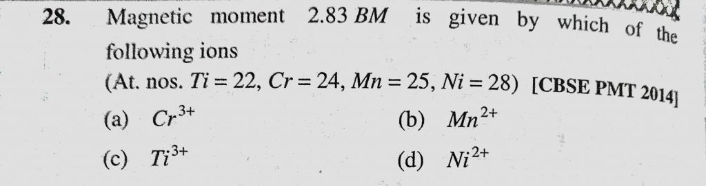 Magnetic moment 2.83 BM is given by which of the following ions (At. nos. Ti = 22, Cr = 24, Mn = 25, Ni = 28) Cr = 24 Magnetic moment 2.83 BM is given by which of the following ions (At. nos. Ti = 22 Mn = 25 Ni = 28) November 29, 2020 Category: Uncategorised (JEE Advanced Physics by BM Sharma + GMP Solutions) , Facebook Messenger WhatsApp Share this:TwitterFacebook Related