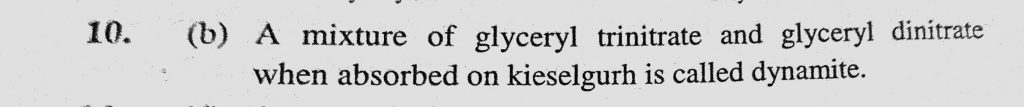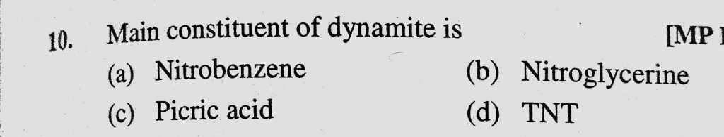 Main constituent of dynamite is (a) Nitrobenzene (b) Nitroglycerine (c) Picric acid (d) TNT Main constituent of dynamite is (a) Nitrobenzene (b) Nitroglycerine (c) Picric acid (d) TNT February 11, 2021 Category: Uncategorised (JEE Advanced Physics by BM Sharma + GMP Solutions) , Facebook Messenger WhatsApp Share this:TwitterFacebook Related