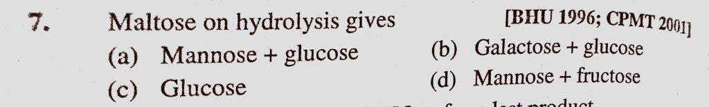 Maltose on hydrolysis gives (a) Mannose + glucose (b) Galactose + glucose (c) Glucose (d) Mannose + fructose Maltose on hydrolysis gives (a) Mannose + glucose (b) Galactose + glucose (c) Glucose (d) Mannose + fructose February 10, 2021 Category: Uncategorised (JEE Advanced Physics by BM Sharma + GMP Solutions) , Facebook Messenger WhatsApp Share this:TwitterFacebook Related